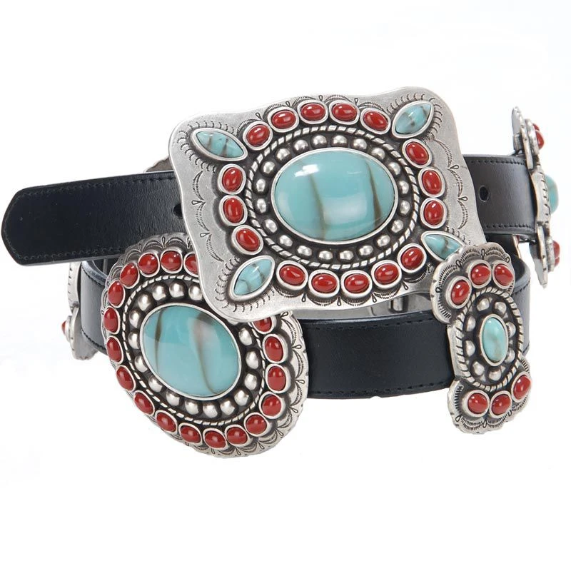 This 3-D belt buckle is made with black leather and is 1 inch wide. It has a square silver belt buckle that will never go out of style! This 3-D belt has 4 large oval conchos that have similar details as the buckle. In between each large concho is a smaller concho. The belt buckle is detailed with an oval turquoise stone that is surrounded with smaller turquoise and red stones. The quality of the leather that this belt is made of is quality and will make the belts shine last longer. Turquoise and red is a fun color combination that goes really well with any solid black or white shirt that will surely make the belt stand out!