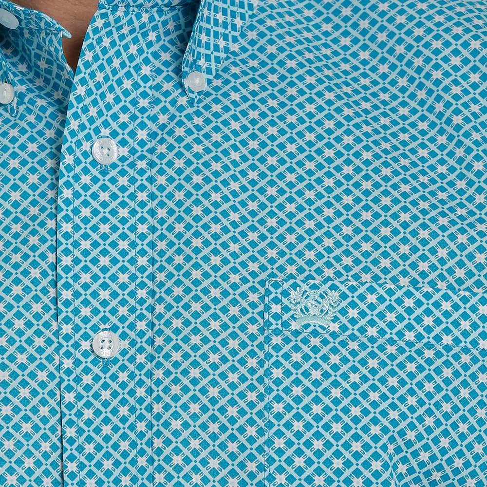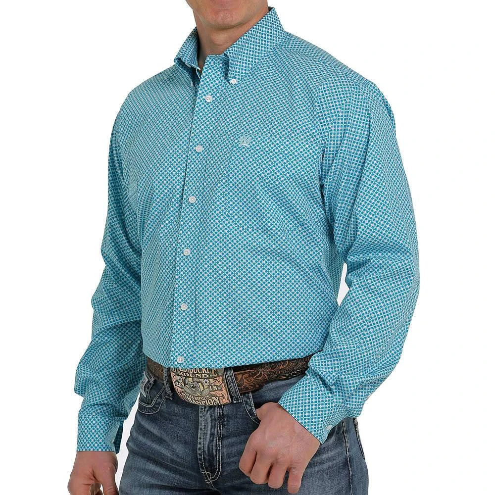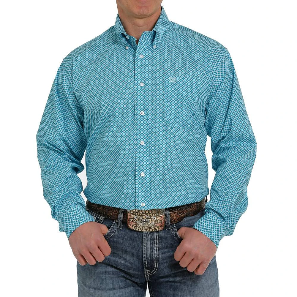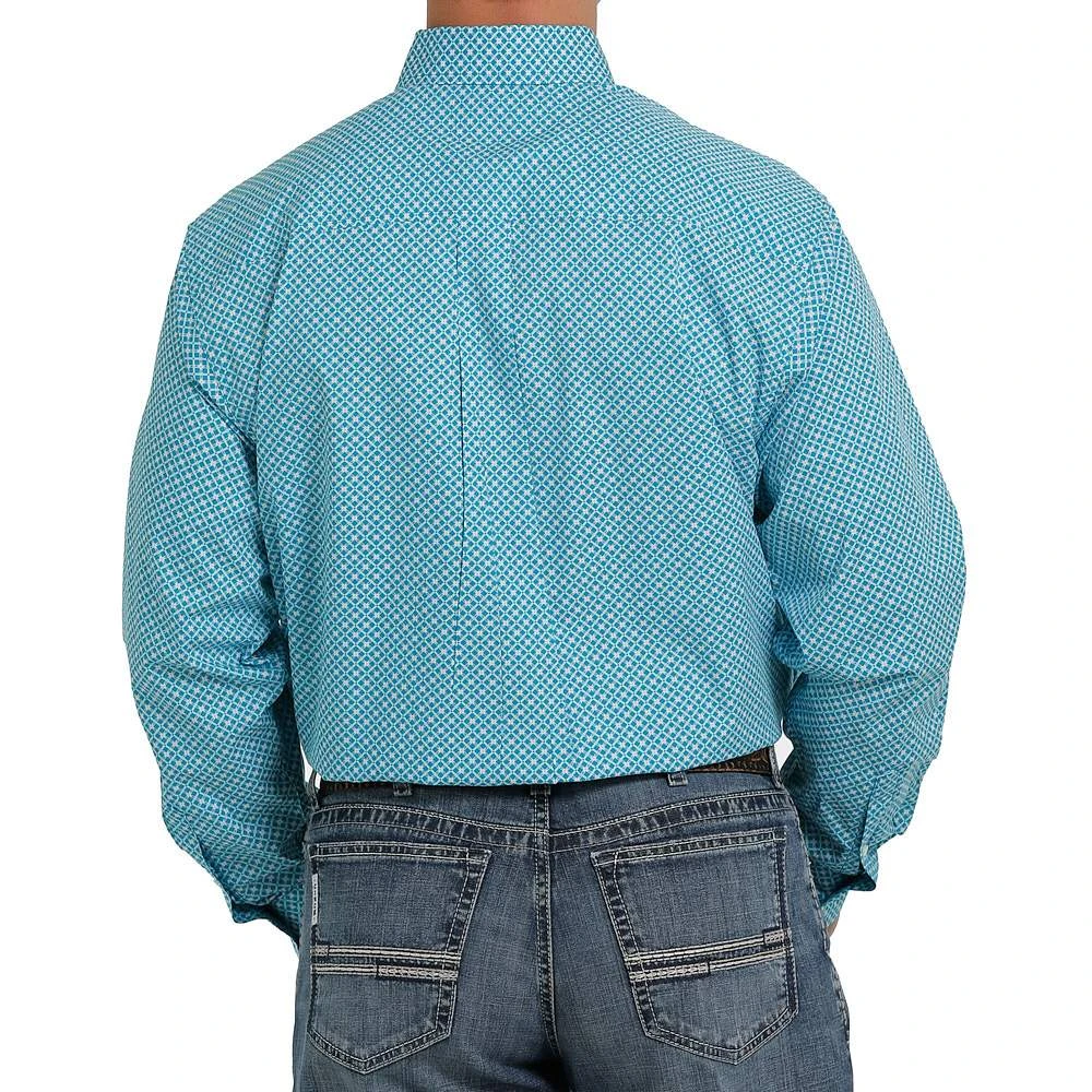 Add some style to your wardrobe wearing our blue and teal print buttondown by Cinch.