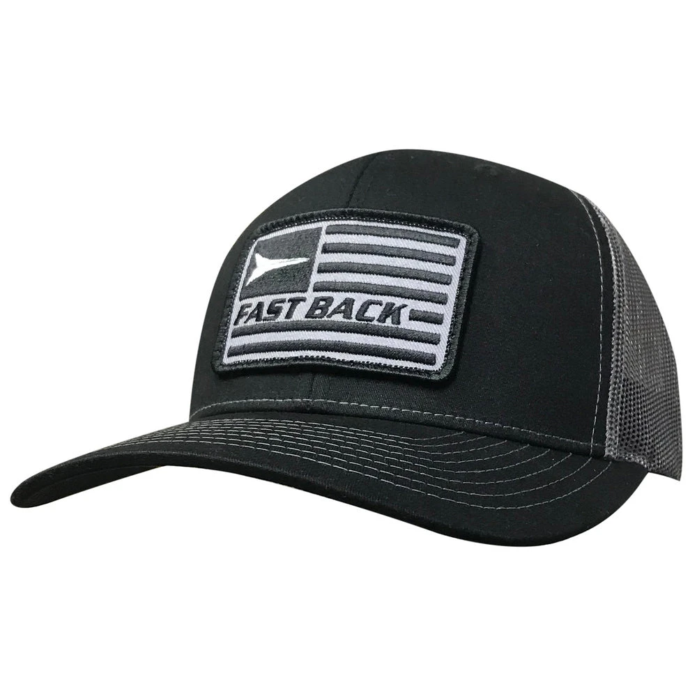 Richardson 112 adjustable snapback. Black with Charcoal mesh. Fast Back flag patch on front