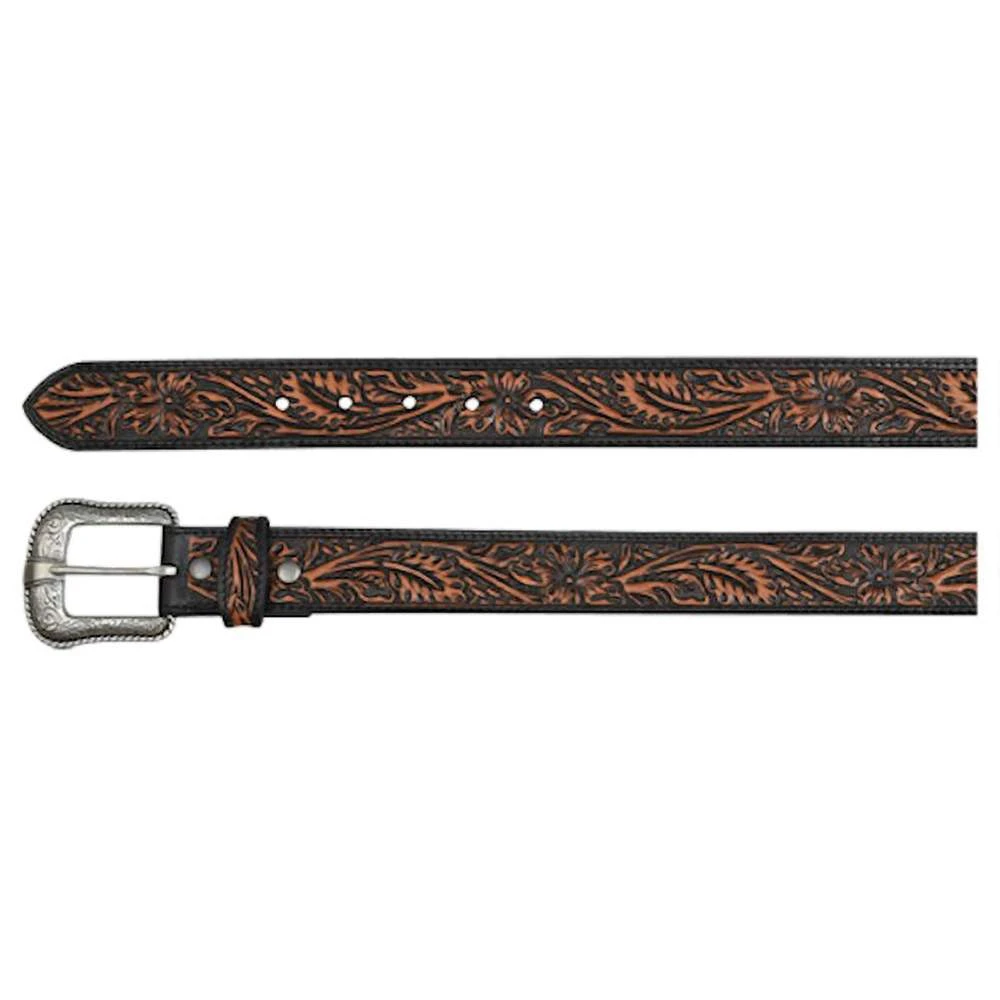 This JP West brown leather belt features tooling, detailed with black accents and a removable buckle.Â