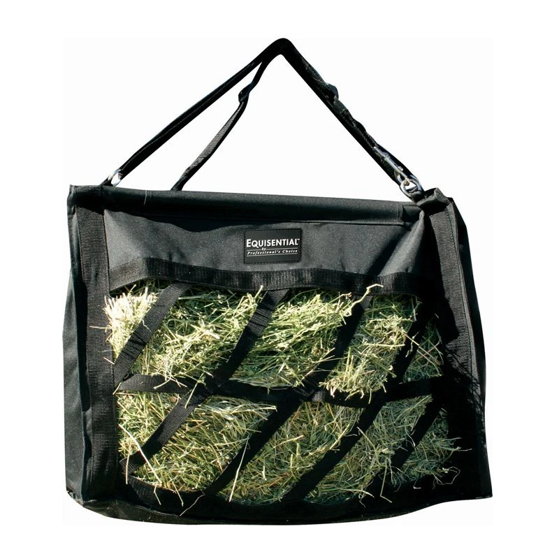 The top loading hay bag features an extra large opening, making it easy to load. The ten diagonal openings regulate the amount of hay taken out at a time, minimizing waste and encouraging a horse to eat more slowly. The mesh bottom allows dirt and debris to fall through. Top flap ensures hay stays in designated area. Two reinforced, adjustable straps for easy hanging in any desired location. Folds flat for convenient storage.