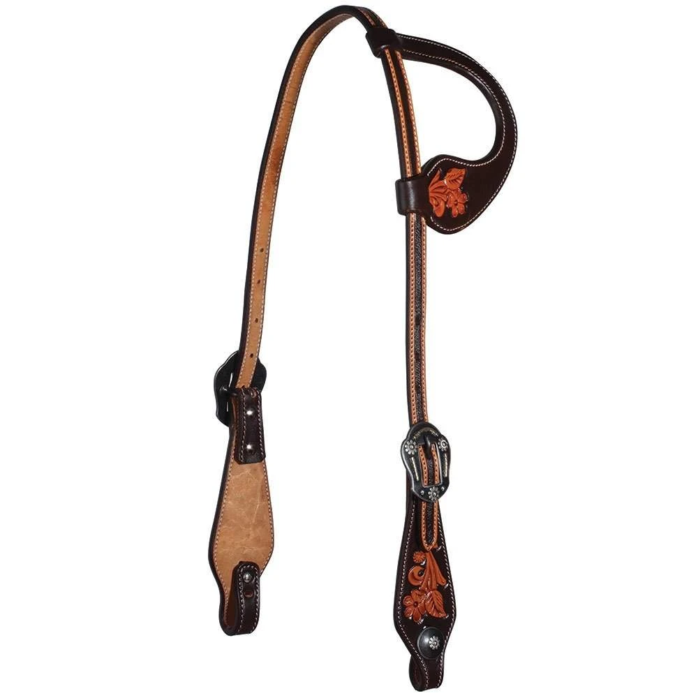 Rich chocolate leather with natural daisy tooling,Single ear headstall.