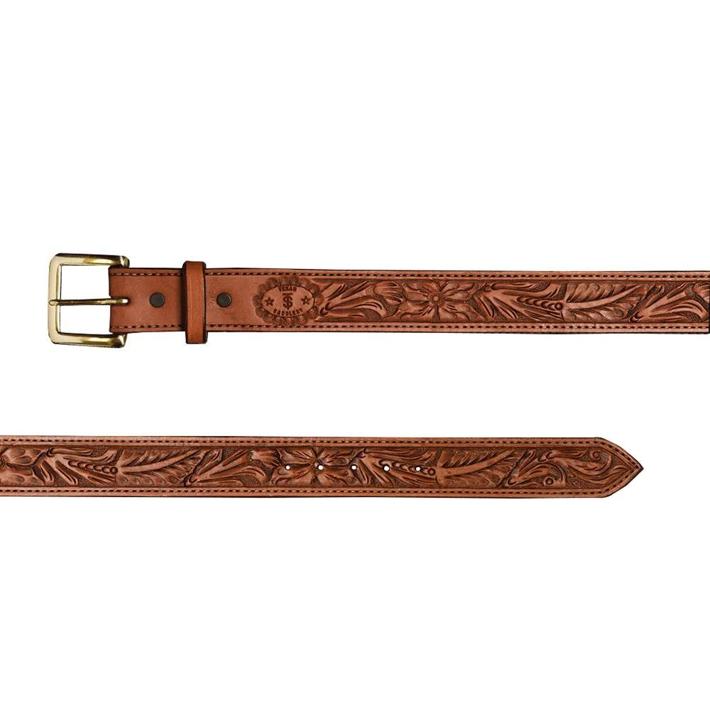This Floral Tooled belt by Texas Saddlery is hand cut with heavy leather lining.