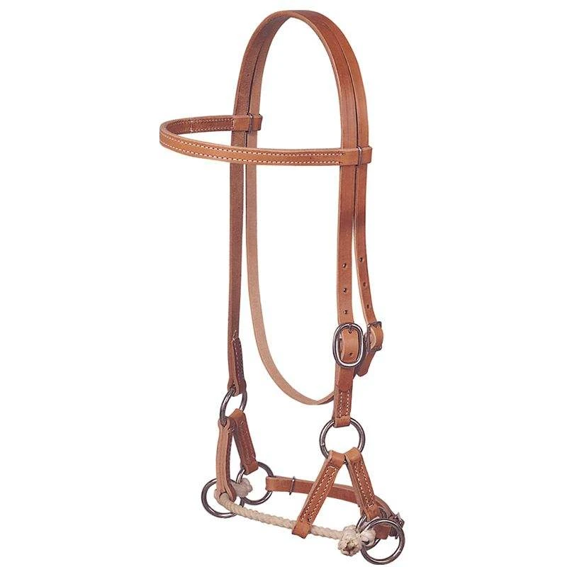 This durable, weather resistant Hermann Oak russet harness leather headstall has a single rope nosepiece for side to side pulling action on the face. The second ring rein attachment allows the rope noseband to roll across the nose. Durable nickel plated hardware. Horse size.