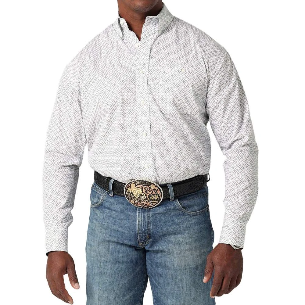 Classic and comfortable, our men’s George Straight long-sleeve button-down one-pocket printed shirt nods to the signature style of everyone’s favorite Texan. It comes with a relaxed fit, pointed collar, a straight back yoke, adjustable cuffs, a curved hem, and a single button-through pocket at the chest to hold any essentials. This everyday staple is crafted from a premium cotton blend you can easily wear all year long. Plus, contrasting print from the outside to the inside helps set your look apart for any occasion, especially when you roll your cuffs. Pair yours with one of the George Strait Cowboy Cut® jeans to complete your outfit.